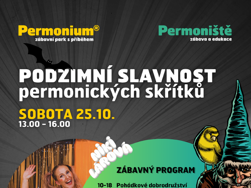 Zažijte kouzelné rodinné odpoledne v Permoniu! ? Přijďte 25. října na Podzimní slavnost permonických skřítků – čeká vás hra, tvoření, malování i pohádková show s Niki LÁROVOU! ?