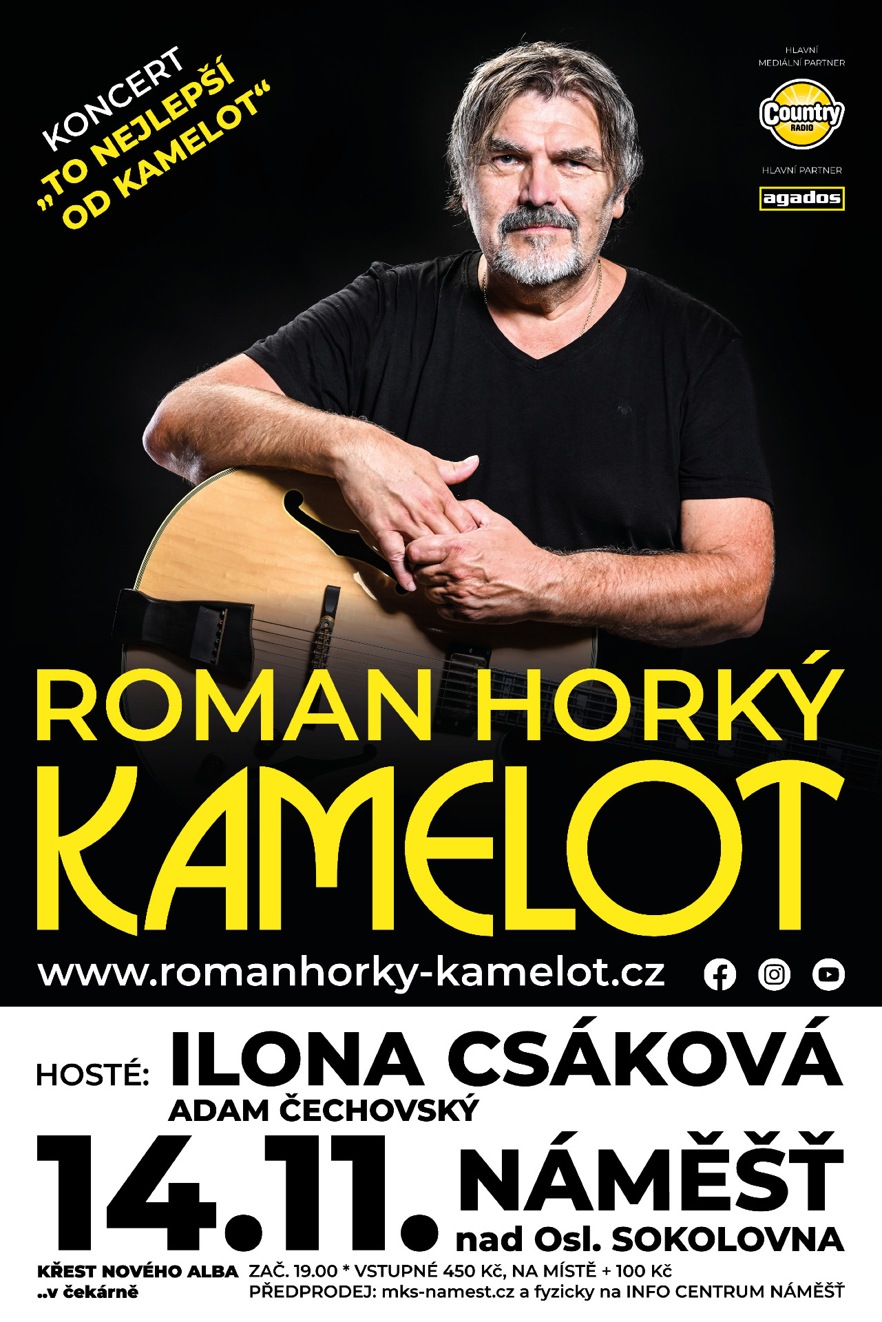 Vážení přátelé a kamarádi, blíží se nám krásný podzimní den 14. 11. 2025. To se v Sokolovně v Náměšti nad Oslavou rozezní struny našich kytar a vy s námi u toho můžete být. Vystoupí Roman Horký se skupinou Kamelot, Ilona Csáková a Adam Čechovský. Vstupenky jak v předprodeji, tak i na místě.